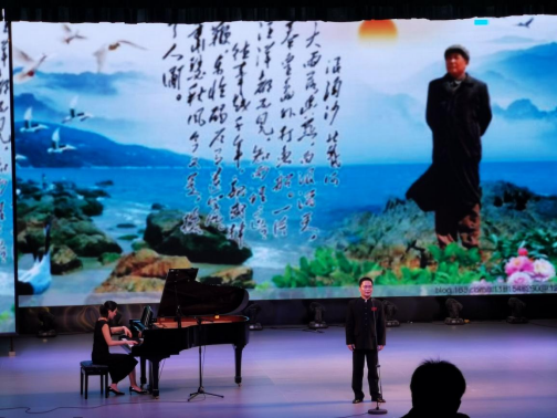唐文生老师带来的男生独唱《浪淘沙.北戴河》,歌声雄浑壮阔。展示了毛主席——无产阶级革命家前无古人的雄伟气魄和汪洋浩瀚的博大胸怀,整个曲目充满了更鲜明的时代感、更深邃的历史感、更辽阔的宇宙感和更丰富的美学容量。