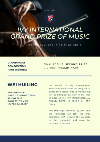 近日,公司青年教师韦慧玲在第九届常青藤国际音乐大赛(THE 9th IVY INTERNATIONAL GRAND PRIZE OF MUSIC)作曲比赛中荣获中国区作曲专业组二等奖,并直接晋级全球总决赛,拟于8月在美国华盛顿进行总决赛。