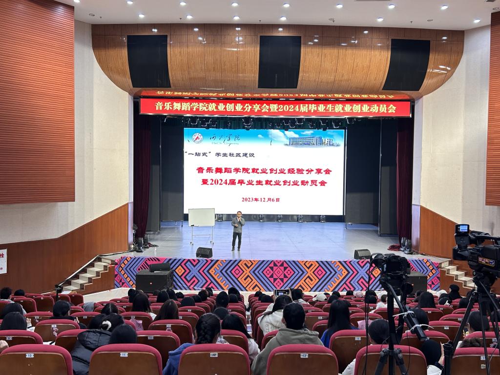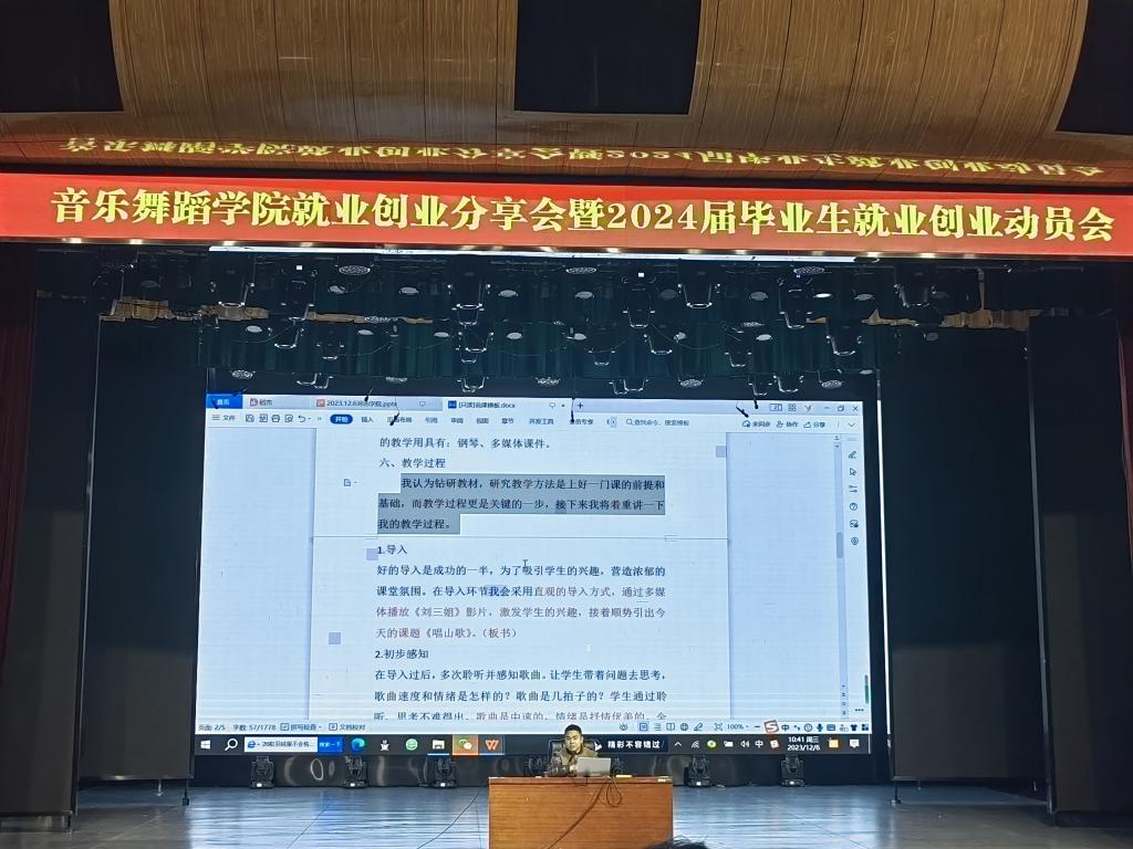 分享会邀请了优秀员工陆艺文化艺术传播有限公司董事长陆贵香、宜州区实验小学音乐教师冀焕坤作了就业创业经验分享会。首先,陆贵香回顾了他七年的创业历程,从酒吧、火锅店、农业公司,再到现在的文艺公司,他与同学们分享了创业过程的曲折与艰辛以及他的创业经验,他指出创业之路充满艰辛,创业人应拥有足够的抗压能力,在创业过程中要学会整合资源,找准定位,瞄准市场,敢于担当,坚定信心,善于总结,不怕失败。同时,他祝愿有创业意愿的同学们早日实现自己的创业梦想。随后,冀焕坤着重为大家介绍了音乐专业毕业生的就业方向与途径,并与同学们分享了教师公招面试技巧,重点分享了教师面试说课技巧,他谈到,目前基层公司艺术教师需求不断增大,就业形势较好,希望同学们合理规划、利用好剩余的大学时光,努力提升自我,为今后的进一步发展打下坚实基础。