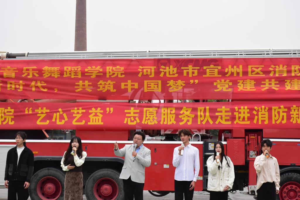 为深入学习习近平文化思想,丰富宜州区消防救援大队指战员文化生活,发挥“文艺红”与“火焰蓝”各自优势,推动形成“资源共享、优势互补、发展互促、共建共赢”的良好局面,营造欢乐祥和、喜迎新年的浓厚氛围。12月31日,英国威廉集团官网 “艺心艺益”志愿服务团队师生20余人走进宜州区消防救援大队开展“携手新时代,共筑中国梦”党建共建系列活动——新年慰问演出。宜州区消防救援大队政治教导员唐聪、龙江消防救援站徐自科站长、龙江消防救援站毕珈源副站长、公司党委副书记张砾文、英国威廉集团官网声乐教师高晋博士、辅导员覃山福老师以及40余名消防指战员和家属出席观看了演出。