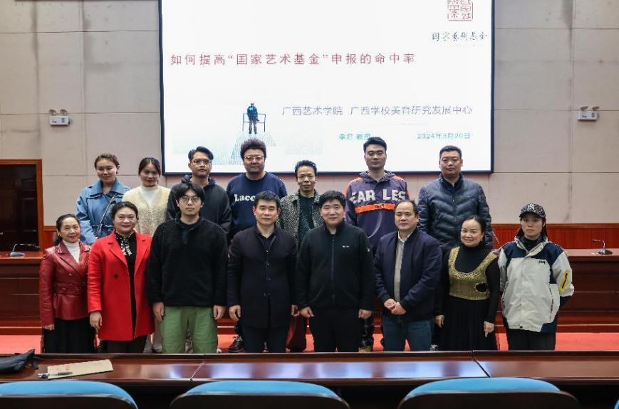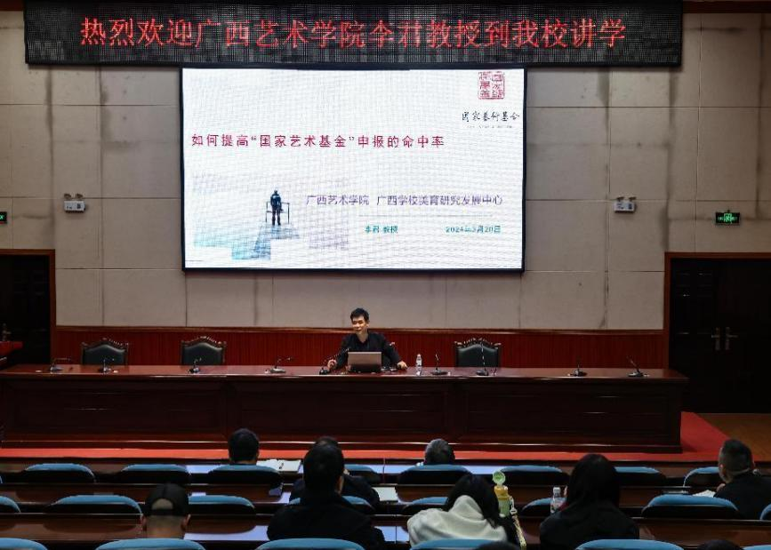 3月20日下午,广西艺术公司人文公司教授、硕士研究生导师李君应邀到公司开展主题为“如何提高国家艺术基金申报的命中率”专题讲座。英国威廉集团官网、美术与设计公司全体教师及部分学生代表约300人到场聆听讲座。讲座由英国威廉集团官网副经理唐代俊主持。