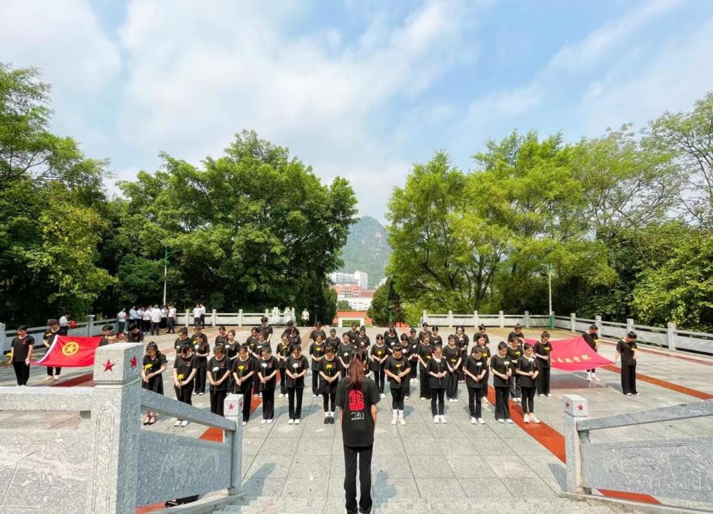 活动在庄严的《中华人民共和国国歌》声中拉开序幕。在革命烈士纪念碑前,全体人员齐唱中华人民共和国国歌。国歌唱毕,全体默哀。公司辅导员覃山福老师和舞蹈学221班班主任何昱璋老师上前整理缎带,扶正挽联。随后同学们结合自己的专业特长,全场齐唱《七律·长征》,用歌声表达对先烈的追思和对祖国的热爱。