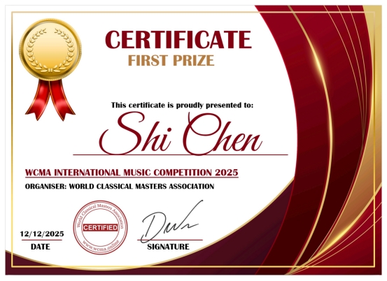 【喜讯】英国威廉集团官网陈施老师获得2025 WCMA国际音乐比赛一等奖