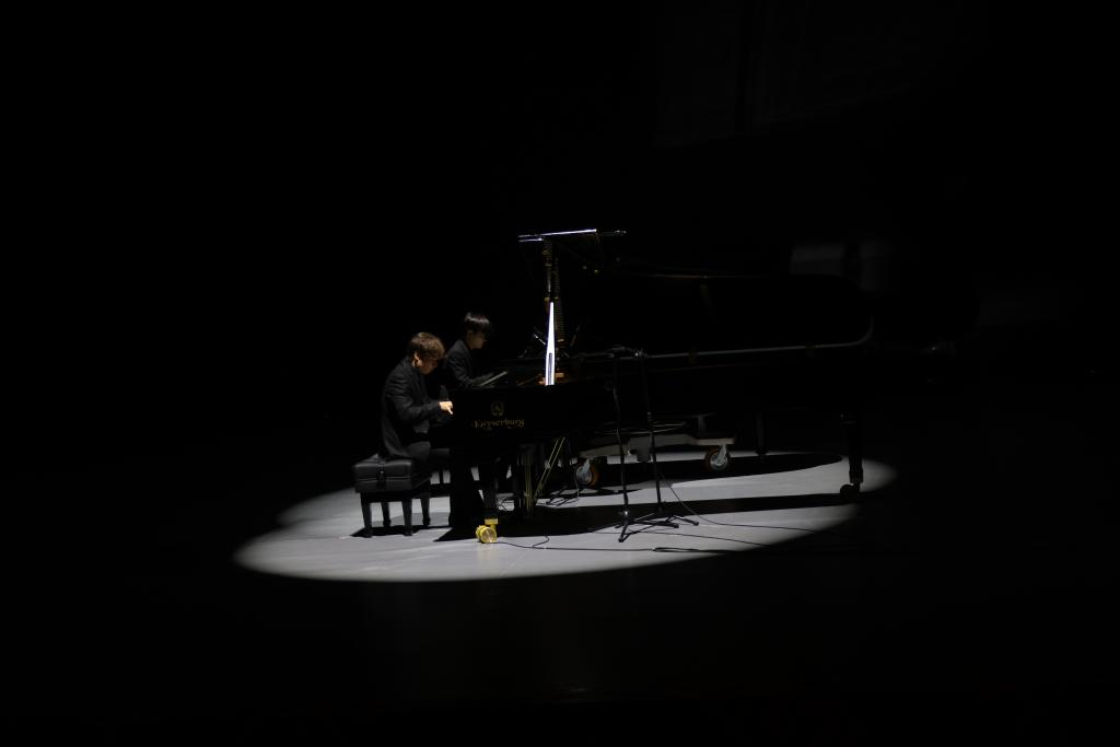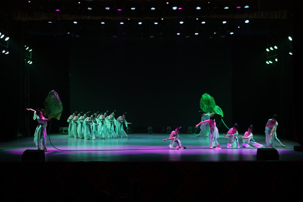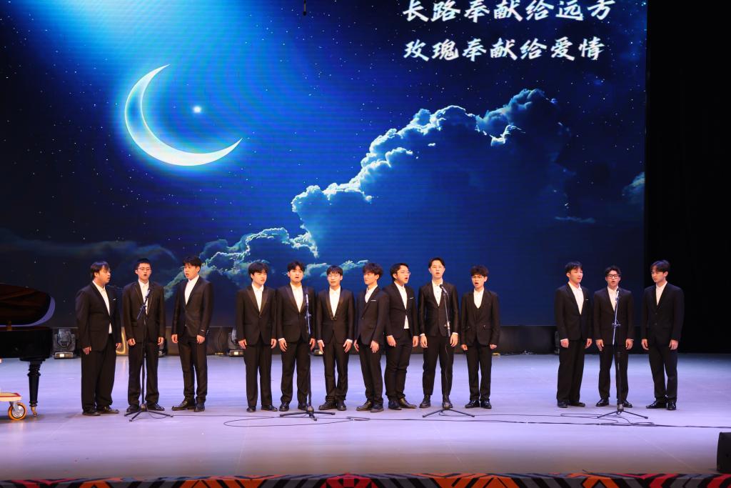 闭幕晚会在大合唱《戴花竹帽的地方》中拉开帷幕,随后展演了小合唱《奉献》、双钢琴《保卫黄河》、歌舞《莲鼓越歌行》、诗文朗诵《密码》等九个节目,台下观众掌声不断,现场气氛热烈。
