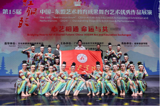 近日,由文化和旅游部科技教育司指导,广西壮族自治区文化和旅游厅、教育厅联合主办的第15届“红铜鼓”中国—东盟艺术教育成果展演活动在桂林落下帷幕。公司获奖作品《“侗”见丰景》(2024年广西艺术基金项目)受邀赴桂林参加此次现场集中展演,同学们的精彩演绎得到观众和业界的一致好评。