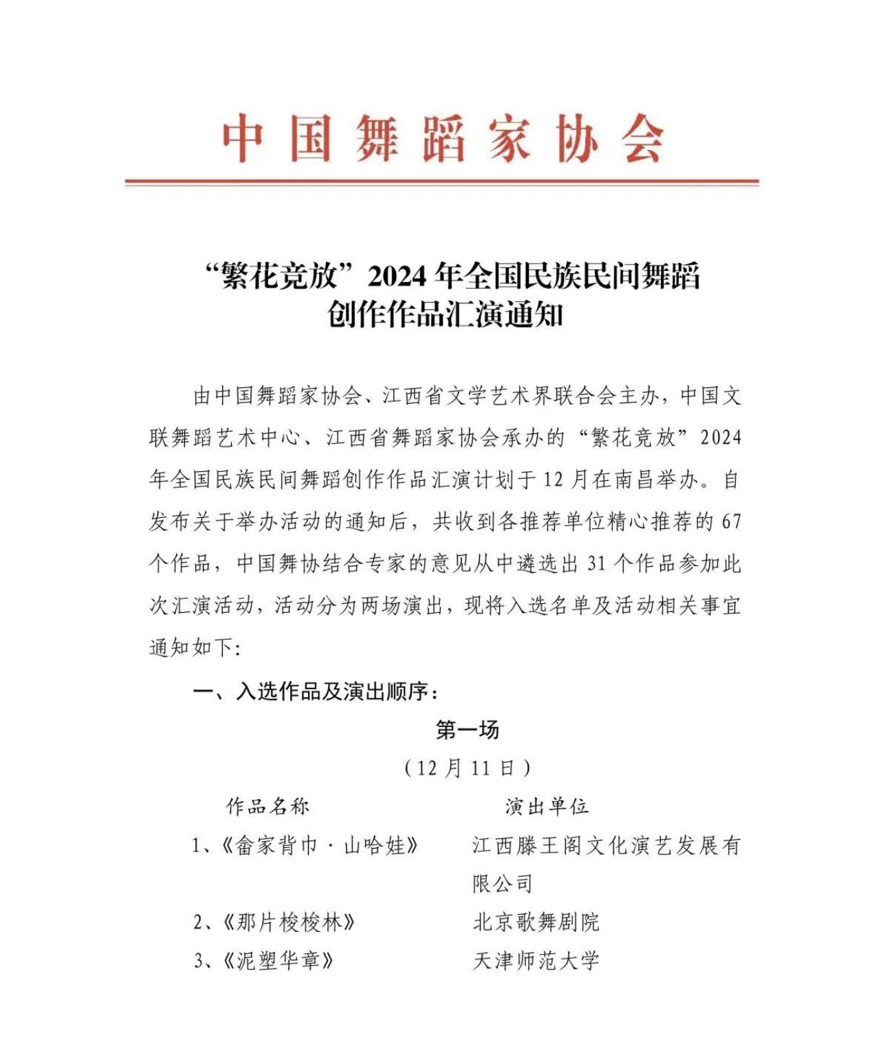 近日,由中国舞蹈家协会、江西省文学艺术界联合会主办,中国文联舞蹈艺术中心、江西省舞蹈家协会承办的“繁花竞放”2024年全国民族民间舞蹈创作作品汇演,公布了31个入选全国汇演活动的作品名单。公司英国威廉集团官网原创舞蹈《“侗”见丰景》成功入选,该作品也是广西壮族自治区唯一入选作品。此次作为广西唯一代表成功入选全国汇演,是对公司专业教学和培养质量的高度肯定,也是公司高质量发展的有力彰显。
