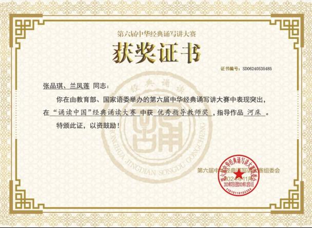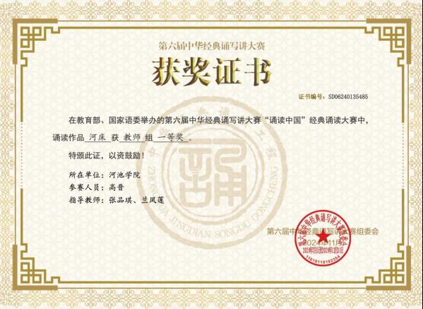 【喜讯】公司教师在第六届中华经典诵读大赛中荣获一等奖