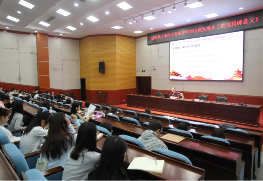 银建军教授通过历史、现实、将来、中西等四个维度对“新时代十点伟大变革在中华民族发展史上的里程碑意义”进行了深入的讲解。从“擘画中华民族伟大复兴蓝图,吹响中华民族发展史上奋进新号角”“全面建成小康社会实现新跨越”“创造人类文明新形态与理论新贡献”“开辟马克思主义新境界与思想新高度”等四个方面,阐述了新时代十年中党和国家事业取得的历史性辉煌成就、社会发生深刻变化,及其在中华民族发展史上的里程碑意义。银教授还向同学们讲解了党的二十大报告中提出的新思想、新观点,他希望同学们能够不负青春使命,奋勇争先,砥砺奋斗,将个人理想与国家前途命运结合起来。