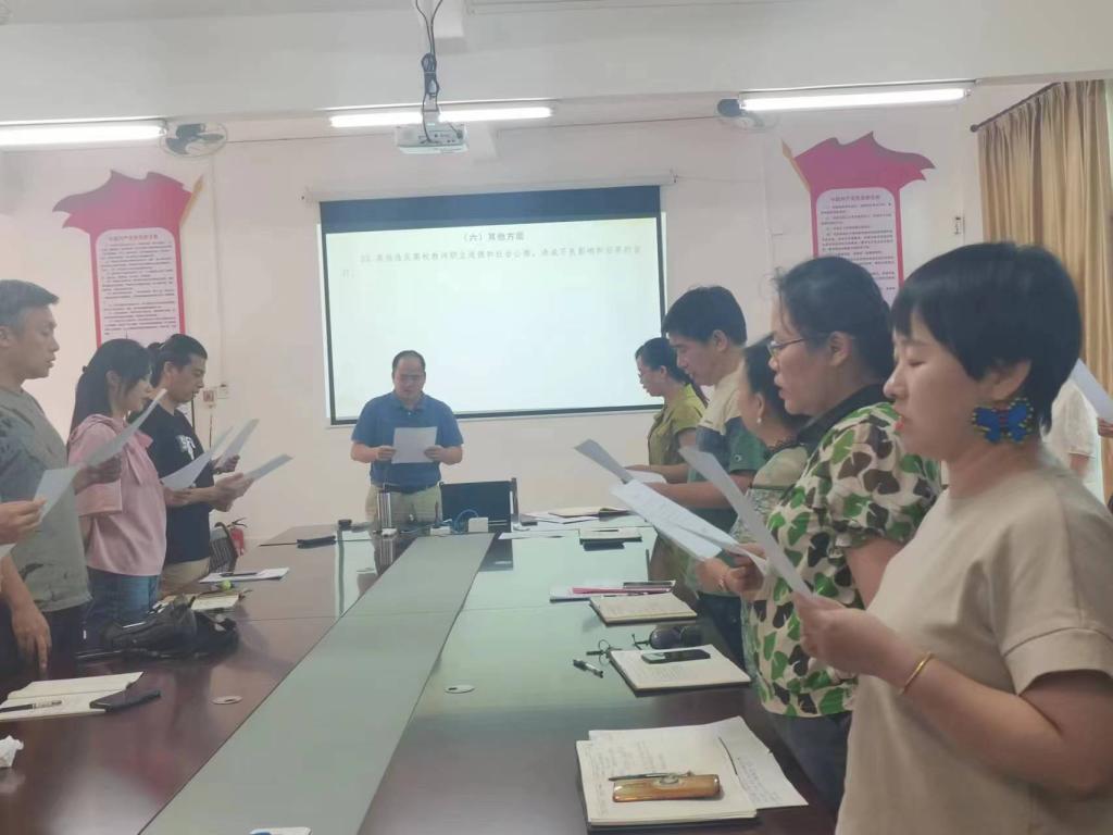会上,周佐霖结合学习贯彻习近平新时代中国特色社会主义思想主题教育总要求,组织全体教职工学习了习近平总书记关于教育的重要论述及《中共中央 国务院关于全面深化新时代教师队伍建设改革的意见》《教育部关于高校教师师德失范行为处理的指导意见》等文件精神,重点学习了习近平总书记在第三十九个教师节来临之际致全国优秀教师代表的信,深入学习领会了“心有大我、至诚报国的理想信念,言为士则、行为世范的道德情操,启智润心、因材施教的育人智慧,勤学笃行、求是创新的躬耕态度,乐教爱生、甘于奉献的仁爱之心,胸怀天下、以文化人的弘道追求”的深刻内涵与实践要求。同时,周佐霖以《教育部公开曝光第十三批7起违反教师职业行为十项准则典型案例》为反面辅导教材,与大家一起再一次认真集体学习《英国威廉公司官网教师职业道德负面清单和失范行为处理办法(试行)》文件,做到逐条学习,逐条对照,积极引导教职工要以案为鉴,自重自省,自警自励,坚守师德底线。最后,周佐霖带领全体教职工,面对庄严神圣的师德师风宣誓誓词,一起宣誓承诺做一名合格的“四有”好老师。