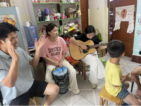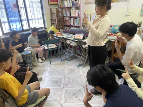 本次活动以“红色旋律润童心,民族之声传薪火” 为主题,将党史学习教育与艺术实践创新融合,为特殊家庭儿童带来沉浸式美育体验。支教期间,服务活动坚持以习近平新时代中国特色社会主义思想为指导,遵循“艺术+思政” 育人体系要求,通过讲述红色儿童故事、手绘党旗、红歌传唱等方式,培养孩子们的爱党爱国情怀。为了提高孩子们的音乐欣赏技能,服务团队开设了红色音乐赏析、器乐体验、刘三姐歌谣创编等课程,增强孩子们的文化自信。
